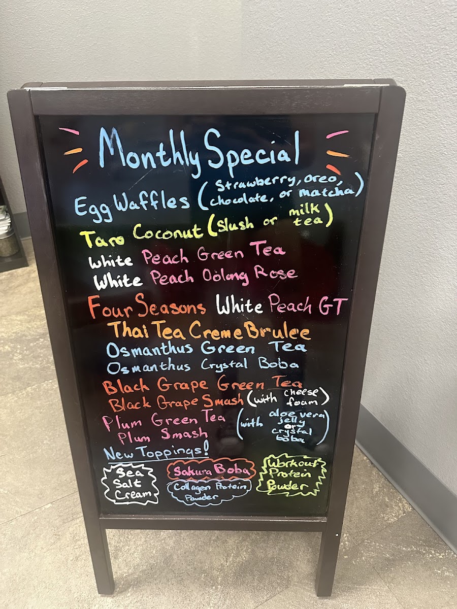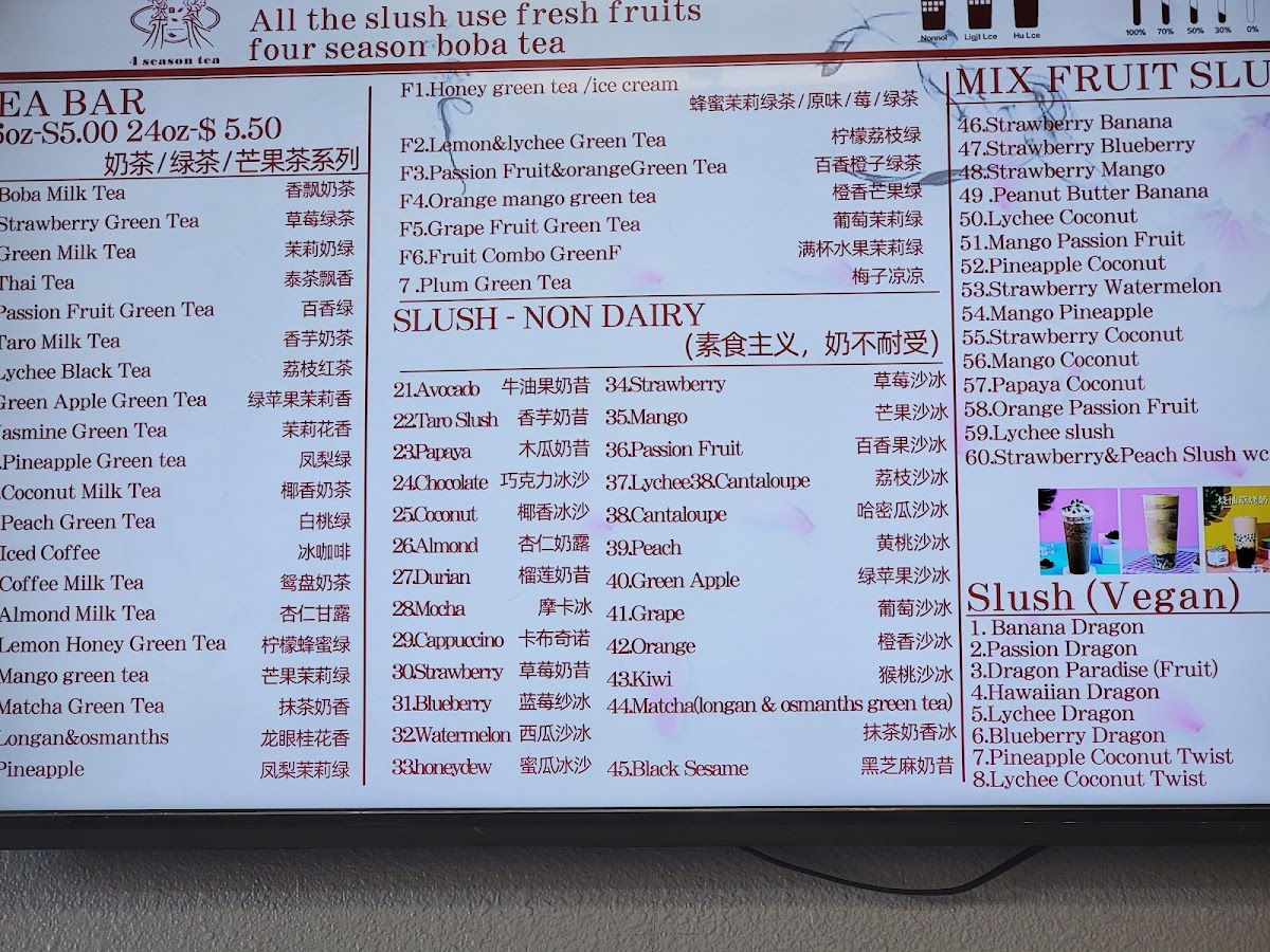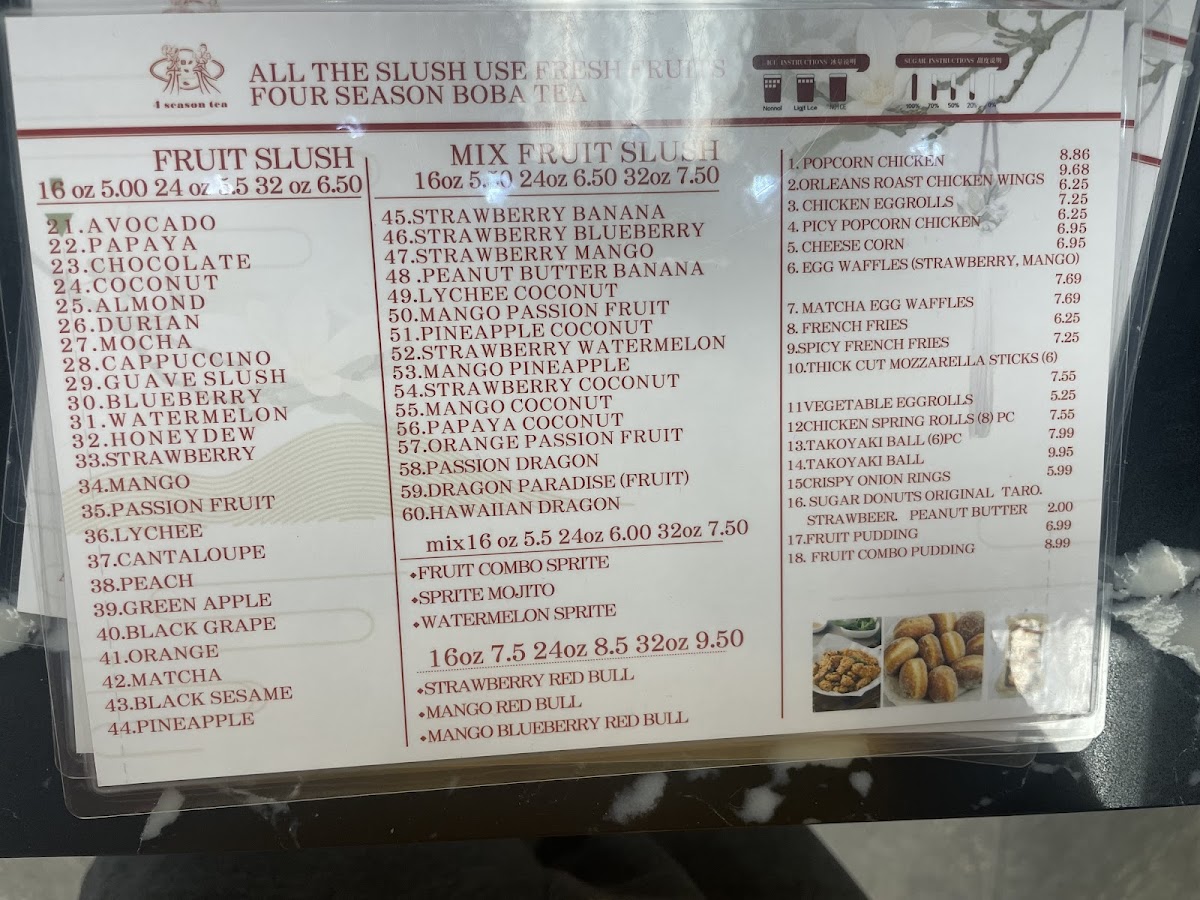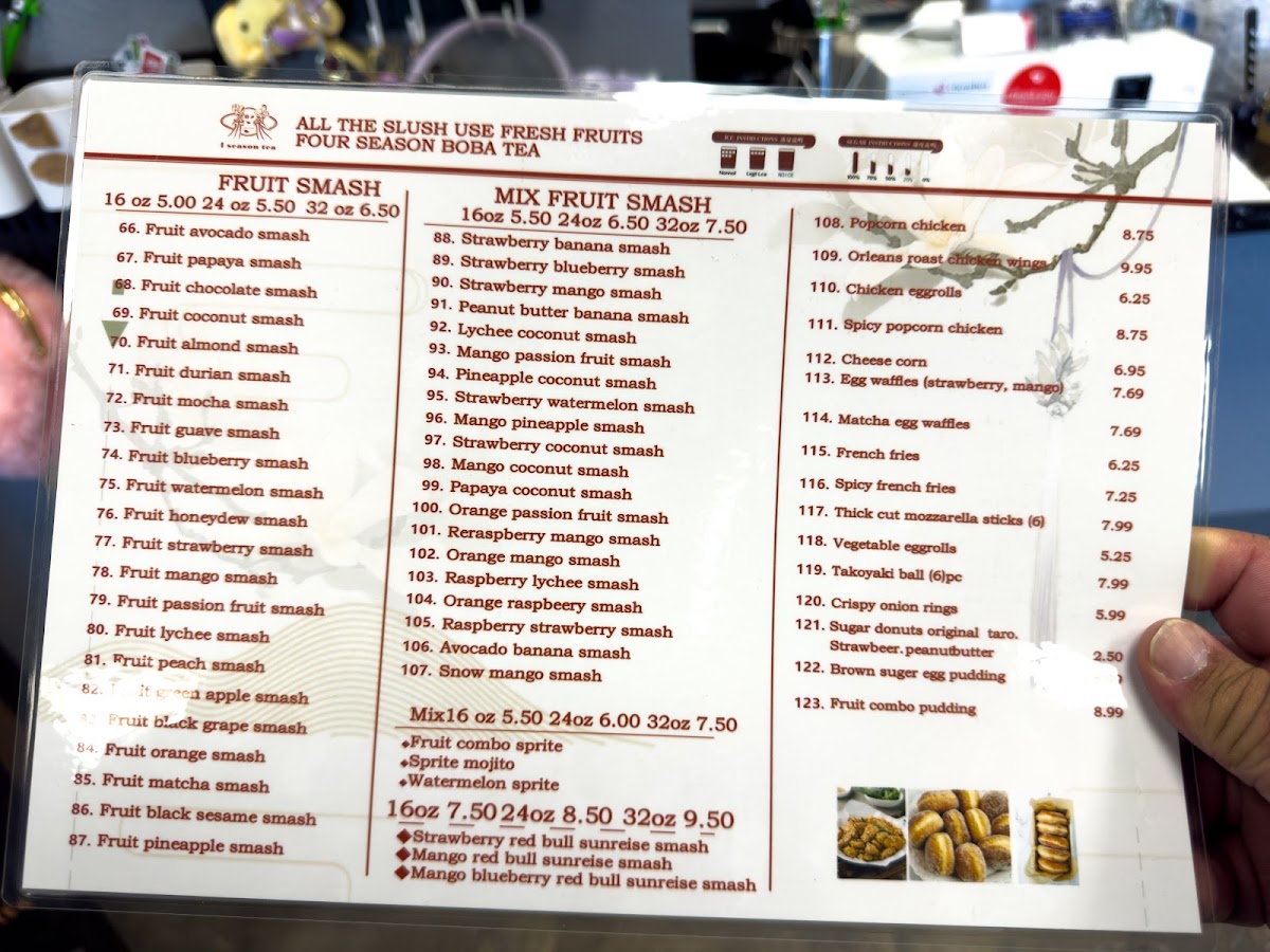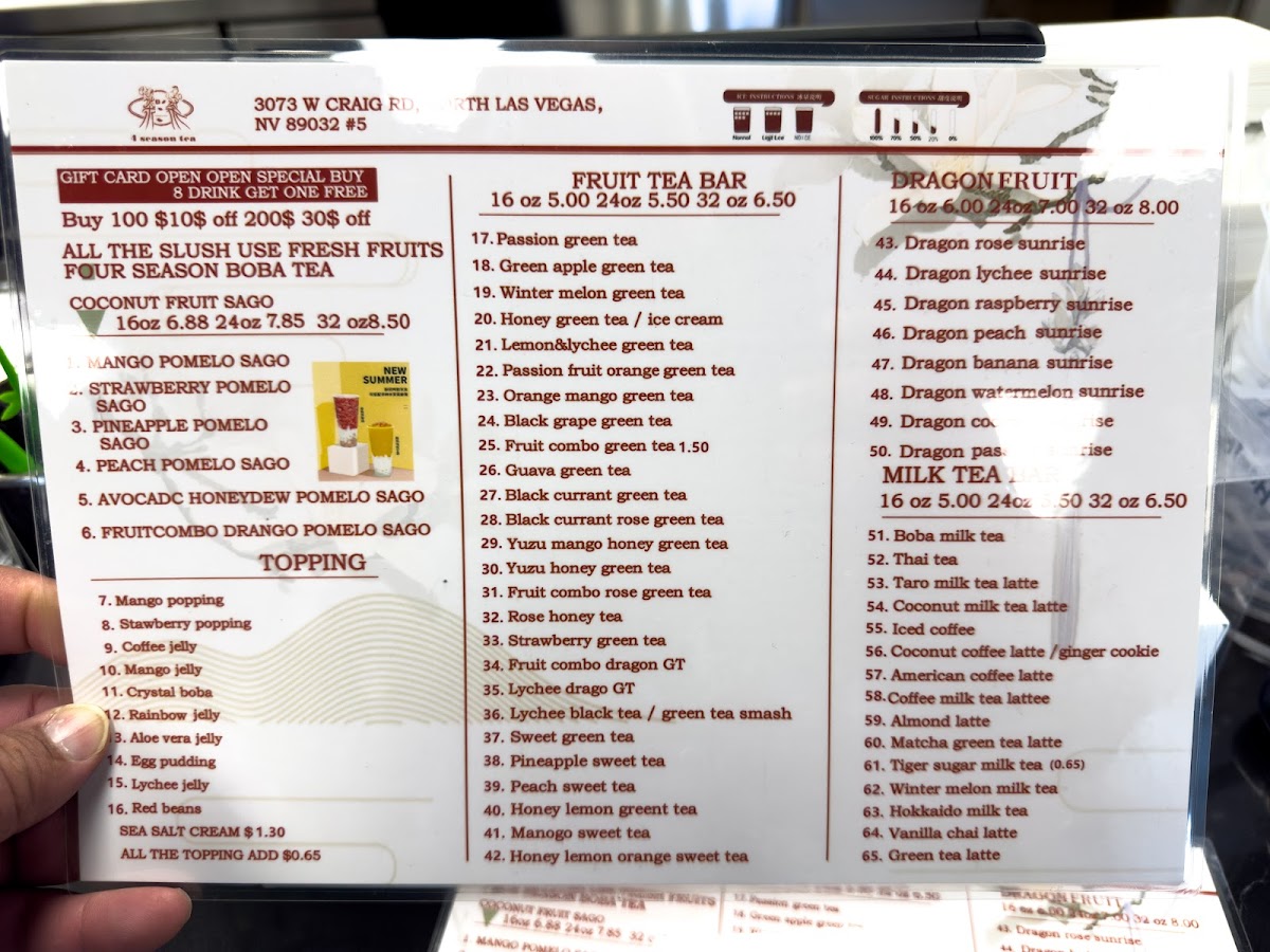 From a reviewer’s perspective, the menu at Four Seasons Boba Tea on W Craig Rd offers a playful and extensive range of treats that cater to both snack lovers and beverage enthusiasts. The food selection impresses with options like Egg Waffles (Strawberry, Mango), Spicy French Fries, Orleans Roast Chicken Wings, Vegetable Egg Rolls, and the decadent Brown Sugar Egg Pudding, each promising bold flavors at approachable prices. The Milk Tea Bar shines with classics such as Boba Milk Tea, Matcha Green Tea Latte, Tiger Sugar Milk Tea, Hokkaido Milk Tea, and Vanilla Chai Latte, ideal for those seeking a creamy, refreshing pick-me-up. Fans of fruity delights will find the Coconut Fruit Sago and Mix Fruit Smash selections irresistible, featuring Mango Pomelo Sago, Avocado Honeydew Pomelo Sago, Fruitcombo Drango Pomelo Sago, Avocado Banana Smash, Mango Passion Fruit Smash, and Lychee Coconut Smash, each offering a sweet, tropical punch. For more vibrant, fizzy options, the Mix drinks like Watermelon Sprite, Strawberry Red Bull Sunrise Smash, Mango Red Bull Sunrise Smash, Sprite Mojito, and Fruit Combo Sprite provide playful refreshment. The Dragon Fruit series is equally enticing, with Dragon Rose Sunrise, Dragon Raspberry Sunrise, Dragon Watermelon Sunrise, Dragon Banana Sunrise, and Dragon Peach Sunrise, balancing tartness and sweetness in every sip. Meanwhile, the Fruit Tea Bar delivers lighter, aromatic choices like Yuzu Mango Honey Green Tea, Black Currant Rose Green Tea, Lemon & Lychee Green Tea, Passion Fruit & Orange Green Tea, and Fruit Combo Green Tea, perfect for tea aficionados. Finally, the Fruit Smash offerings, including Fruit Almond Smash, Fruit Black Sesame Smash, Fruit Guava Smash, Fruit Blueberry Smash, and Fruit Durian Smash, round out a menu that is both inventive and indulgent, making Four Seasons Boba Tea a destination for those seeking both classic favorites and adventurous new flavors.